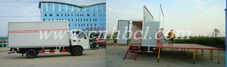1:4米車廂底盤; 2:舞臺面積25-30平方米; 3:用汽缸電動式打開方式,一個人遙控一個人輔助十幾分鐘能打開舞臺。 類別 配置明細 頂部 頂部0~80度開啟 舞臺地板 舞臺板(10mm竹膠板) 舞臺電路 廂體內(nèi)部布局安裝配電盤、照明、布局舞臺燈光線路、電源插座。 配電系統(tǒng) 外接插座采用安全防爆式、220v外接電源,電源線長50米,配卷線盤,安全保護開關(guān) 舞臺支撐腿 隱藏式可調(diào)節(jié)支撐腿 舞臺承重要求 滿足每平方米200kg負荷 舞臺步梯 一個步梯