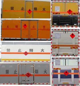 該車適用于運(yùn)輸危險(xiǎn)品。廂體頂部封閉, 不可開(kāi)啟。該車用于運(yùn)輸具有獨(dú)立容器(瓶)包裝的二甲苯, 苯, 甲苯, 乙醛, 松油, 正丙醇, 丙醛, 松香油, 二丁醚, 乙酸正丙酯, 甲醇, 乙醇, 涂料溶液, 甲醛溶液, 印刷油墨, 類項(xiàng)號(hào):3。防護(hù)材料:Q235A碳鋼, 連接方式:左右側(cè)面及后下部防護(hù)均采用焊接連接, 后部防護(hù)斷面尺寸(mm):120×50, 后部防護(hù)離地高度(mm):530。僅采用底盤子午線輪胎和帶ABS的底盤, 該車前輪安裝盤式制動(dòng)器, 前置排氣管, 裝配限速裝置, 限速80km/h。安裝帶有衛(wèi)星定位功能的行駛記錄儀。ABS型號(hào)/生產(chǎn)廠家:ABS-E 4S/4M/威伯科汽車控制系統(tǒng)有限公司。油耗對(duì)應(yīng)關(guān)系(L/100km):37(YC6J220-50), 37(YC6JA220-50)。隨底盤選裝駕駛室, 選裝側(cè)門型式及位置, 選裝后部液壓尾板, 后部液壓尾板收起狀態(tài)長(zhǎng)度是250mm。廂體顏色可變化, 文字噴涂位置可變化。