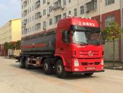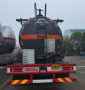該車適用于危險品運輸。類項號:8; 罐體有效容積:17.5立方米, 可選裝襯塑工藝; 罐體外形尺寸(長×直徑)(mm):8200XΦ1800(襯塑時); 罐體外形尺寸(長×直徑)(mm):8000XΦ1700(不襯塑時)。防護材料:Q235A碳鋼, 連接方式:左右側(cè)面及后下部防護均采用焊接連接, 后部防護斷面尺寸(mm):100×50, 后部防護離地高度(mm):475。僅采用底盤子午線輪胎和帶ABS的底盤; 該車前輪安裝盤式制動器, 前置排氣管, 裝配限速裝置, 限速80km/h。安裝帶有衛(wèi)星定位功能的行駛記錄儀。ABS系統(tǒng)生產(chǎn)廠家:東風(fēng)電子科技股份有限公司, 東風(fēng)電子科技股份有限公司汽車制動系統(tǒng)公司, 型號:3550X-1010, DETC-ABS-4S/4M。發(fā)動機油耗對應(yīng)關(guān)系(L/100km):40.49(YC6A270-50)。隨底盤選裝同系列平頂駕駛室。整車長/軸距/后懸(mm)對應(yīng)關(guān)系為:10940/1850+4200+1300/2090。危險貨物運輸車輛的類型(AT型車輛)。