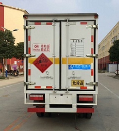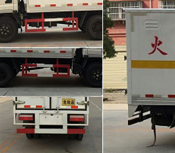 該車適用于運(yùn)輸危險(xiǎn)品。危險(xiǎn)貨物運(yùn)輸車輛的類型為EX/Ⅲ。廂體頂部密封, 不可開(kāi)啟。運(yùn)送爆炸品的品名:黑火藥, 壓縮黑火藥, 電(非電)引爆雷管, 爆破炸藥, 導(dǎo)爆索, 點(diǎn)燃導(dǎo)火索.煙花爆竹。整車長(zhǎng)/軸距/后懸對(duì)應(yīng)關(guān)系為(mm):5250/2700/1320, 5100/2380/1490, 5250/2550/1470。安全裝置為導(dǎo)靜電帶, 用于防止靜電。運(yùn)送爆炸品的項(xiàng)號(hào):1.1D, 1.1D, 1.1B, 1.1D, 1.4G.1.4G.側(cè)防護(hù), 后防護(hù)與車輛均采用焊接連接, 材料均為:Q235A, 后防護(hù)斷面尺寸(mm):110×50, 離地高度:400mm。僅選用發(fā)動(dòng)機(jī)4DW93-73E5對(duì)應(yīng)的油耗值為(L/100km):12.48。該車前置排氣管, 安裝限速裝置, 限速80km/h, 該車安裝帶有衛(wèi)星定位功能的行駛記錄儀, 僅采用前盤(pán)制動(dòng)器和安裝ABS的底盤(pán), 僅采用子午線輪胎。ABS系統(tǒng)型號(hào)/廠家: XN-3730601/濟(jì)南鑫寧汽車配件有限公司, CM4YL/廣州科密汽車電子控制技術(shù)股份有限公司。