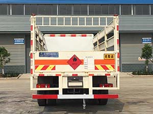 該車適用于運輸危險物品為危化品運輸車。主要用于運輸具有獨立容器(瓶)包裝的液化石油氣,丁烷,乙炔,乙烷,丙烷,丁烯,打火機或打火機加油器,二氧化碳,壓縮氧(氮,空氣,氦,氬,氖),類項號:2.1,2.2。該車運輸的介質為2.1項易燃氣體時,車輛采用”易燃氣體”標識牌,運輸的介質為2.2項非易燃無毒氣體時,車輛采用”不燃氣體”標識牌。整車長/軸距/前懸/后懸對應關系為(mm):9000/5000/1430/2570, 8600/4700/1430/2470,該車安裝帶有衛星定位功能的行駛記錄儀,僅采用前盤制動器和安裝ABS以及前置消聲器的底盤,采用子午線輪胎,前置排氣管,安裝限速裝置,限速80km/h。安全裝置為導靜電帶,用于防止靜電。側防護和后防護裝置材料材質為Q235B碳鋼,側防護與箱體底部焊接連接,后防護裝置與車架采用焊接連接。后防護截面尺寸(mm):140×50,離地高度為500mm。ABS型號:3631010-C2000,ABS 8;ABS生產廠家:東科克諾爾商用車制動系統(十堰)有限公司。   隨底盤選裝駕駛室前面罩,選裝側窗玻璃;駕駛室頂部中間三個裝飾燈為選裝件;前霧燈為選裝件;駕駛室前臉擾流罩為選裝件。