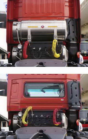選裝平頂駕駛室,平頂駕駛室頂部導流罩為選裝件,高頂駕駛室頂部氣喇叭為選裝件;駕駛室后側擾流板和側裙板為選裝件,選裝前保險杠。選裝燃料罐體。發動機YC6MK375N-30、YC6M340N-30、EQRN350-30、EQRN380-30對應準拖掛車總質量37185;發動機YC6M320N-30對應準拖掛車總質量36385,配置變化引起的質量參數變化在3%以內,可忽略不計。選裝前下視鏡安裝位置。 |