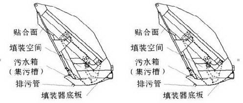 湖北程力壓縮式垃圾車對(duì)污水的集污能力體現(xiàn)在污水箱的設(shè)計(jì)上,通常有兩種辦法:一種是將污水箱設(shè)在填裝器前下部,可較好利用壓縮式垃圾車填裝器與廂體下部之間的空間,還可減小車輛后懸,增大離去角,但污水箱容積小,擴(kuò)容潛力也小,如圖1;另一種是將壓縮式垃圾車污水箱設(shè)在填裝器底板下,放棄利用填裝器與廂體下部之間的空間,同時(shí)增大車輛了后懸,減小了離去角,污水箱容積大,擴(kuò)容潛力也大,如圖。