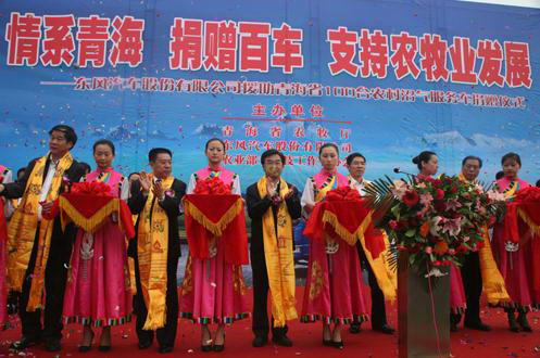 由青海省農牧廳、中國老科協主辦,東風股份協辦共同舉行捐贈儀式,同時啟動青海沼氣吸糞服務體系建設計劃。來自國家農業部、青海省、東風股份的相關領導出席捐贈儀式。東風股份黨委副書記鄭加坤把象征著100輛東風沼氣吸糞車的鑰匙交給了青海省農牧廳。
