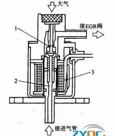 EGR閥1膜片下部通大氣,裝有彈簧的另一邊為真空室,其真空度由EGR電磁閥2控制。增大真空室的真空度,使膜片克服彈簧力上拱,閥的開度增大,廢氣再循環量增大。當上部失去真空度時,膜片在彈簧力的作用下向下拱而使閥關閉,阻斷廢氣再循環。