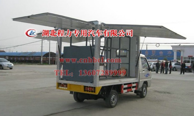 流動售貨車是在車廂的側翼上安裝有能夠伸縮的空氣彈簧,使側翼可以繞鉸鏈向上旋轉85°,成為能遮陽擋雨的頂棚。在車廂底板的兩側安裝有可拆卸的貨架,在側翼內部的中間位置安裝有照明燈,使工作人員的售貨工作空間大,而且可以在夜間工作,便于貨物儲存和搬運,操作既方便又安全。