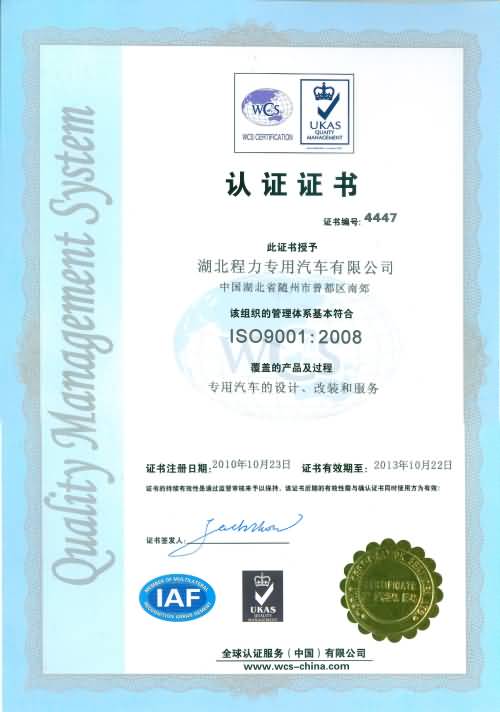 湖北程力集團專用汽車有限公司最新質(zhì)量體系認(rèn)證證書ISO9001:2008