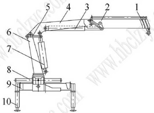 折臂式隨車吊展開狀態1.吊鉤 2.吊臂總成 3.折疊液壓缸 4.主臂 5.連桿 6.立柱 7.變幅液壓缸 8.回轉液壓缸 9.橫梁組 10.支腿機構及控制系統