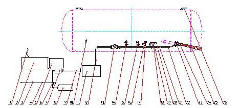 1.離合器踏板 2.發動機 3.電開關 4.電線 5.變速箱 6.電磁氣閥 7.取力器 8.儲氣筒 9.傳動軸 10. 壓力表 11. 空壓機 12. 進氣管 13.止回閥 14、球閥 15、球閥 16.安全閥(0-0.3Mpa) 17.中小異徑三通 18、球閥 19.異徑外接頭 20.球閥 21 止回閥 22. 蒸汽膠管 23.蝶閥 24.二次吹氣總成 25.出料軟管 26. 卸壓管路