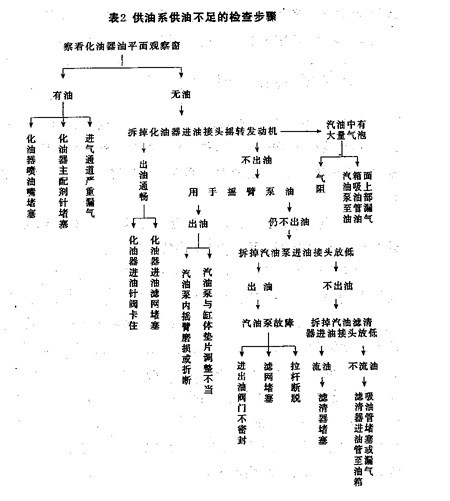 油路故障,一般是堵、漏、壞等原因造成的。若油箱有油,并且開關(guān)已打開,檢查故障,可參考表 2 中的順序檢查。