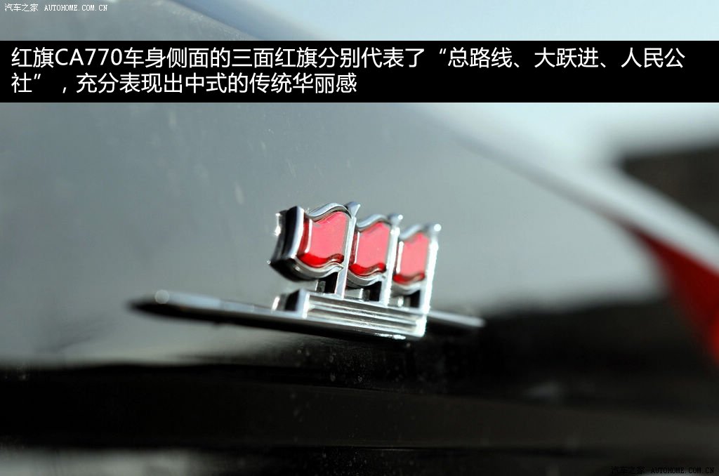 紅旗CA770整車的內外設計均滲透了濃濃的中國特色。CA770的外形更加協調精致,突破了紅旗CA72車型“大、平、方、正”的感覺,直立式的尾燈內包含了古代宮燈的造型,車身側面的三面紅旗代表了“總路線、大躍進、人民公社”,充分表現出中式的傳統華麗感。CA770長為5980mm,軸距達到了3720mm,即使在今天看來也絕對稱得上是個龐然大物。