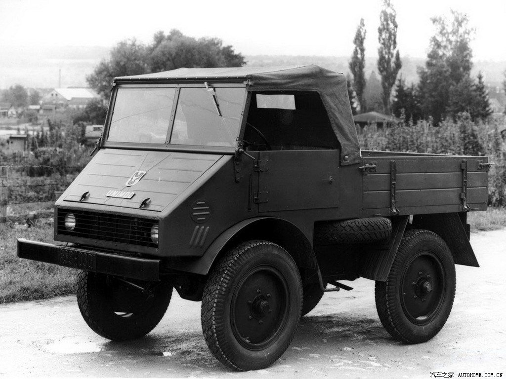 1946年下半年,弗里德里希成功地制造出第一輛試作車,有著傾斜的車頭發(fā)動(dòng)機(jī)蓋,軟頂?shù)鸟{駛艙,與艙后的載貨平臺(tái),整體的造型已經(jīng)與后來(lái)實(shí)際量產(chǎn)的車輛非常一致。在此同時(shí),新車也首次獲得正式的命名——Universal-Motor-Gerät(泛用自走機(jī)具,universally applicable motorised machine),縮寫就稱為“Unimog”。
