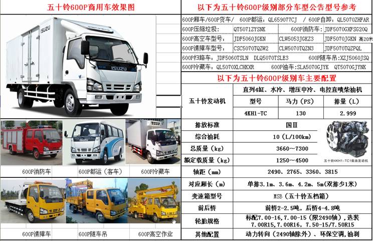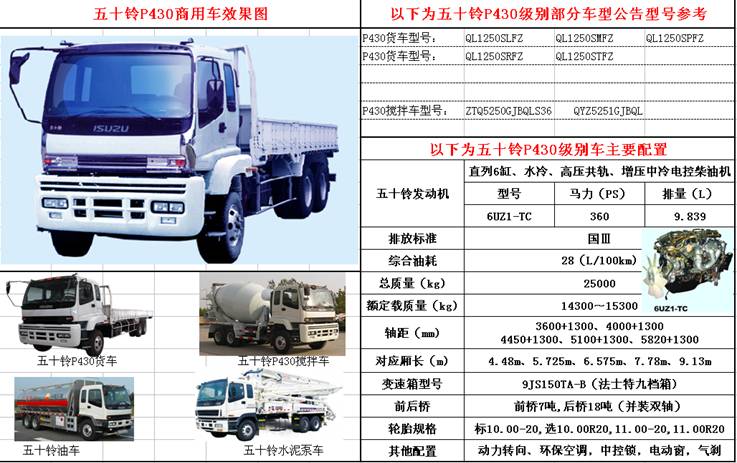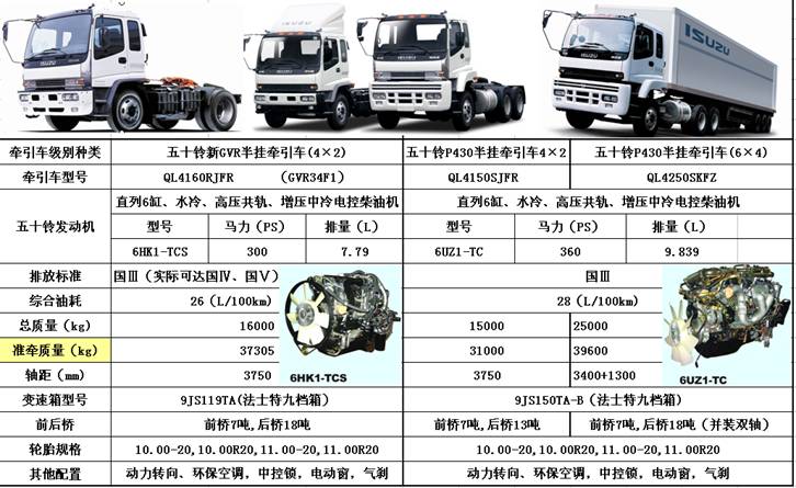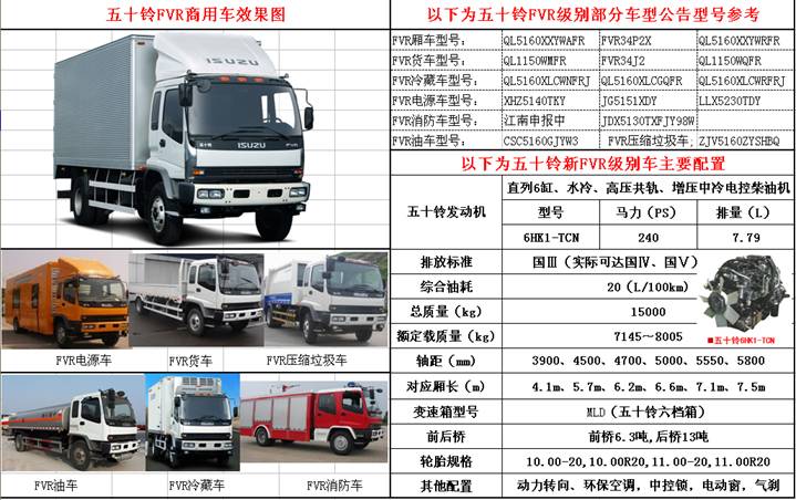 接著是五十鈴單橋重卡-------新FVR系列--------底盤型號以QL1150/QL1160打頭,通用240馬力6HK1-TCN五十鈴發(fā)動(dòng)機(jī),五種軸距。(原來FVR系列260馬力6HK1-TC 發(fā)動(dòng)機(jī)車型處于限產(chǎn)狀態(tài)需打報(bào)告生產(chǎn))