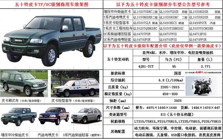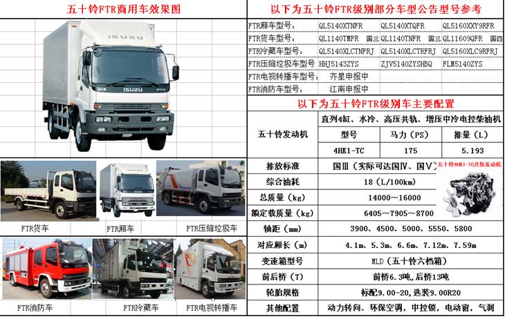 加強(qiáng)型中卡系列-------FTR 系列------- 底盤型號以QL1140 /QL1160 打頭,F(xiàn)TR國三車通用4HK1-TC五十鈴發(fā)動(dòng)機(jī),F(xiàn)TR國四車通用4HK1-TCG40五十鈴發(fā)動(dòng)機(jī),該級別車全部為排半駕駛室,有五種軸距,慶鈴本廠有63款公告型號。
