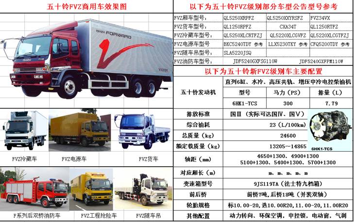 下面是五十鈴后雙橋重卡-------新FVZ系列--------底盤以QL1250R打頭,通用300馬力6HK1-TCS五十鈴發(fā)動(dòng)機(jī),五種軸距。(原來FVZ系列260馬力6HK1-TC 發(fā)動(dòng)機(jī)車型處于限產(chǎn)狀態(tài)需打報(bào)告生產(chǎn))
