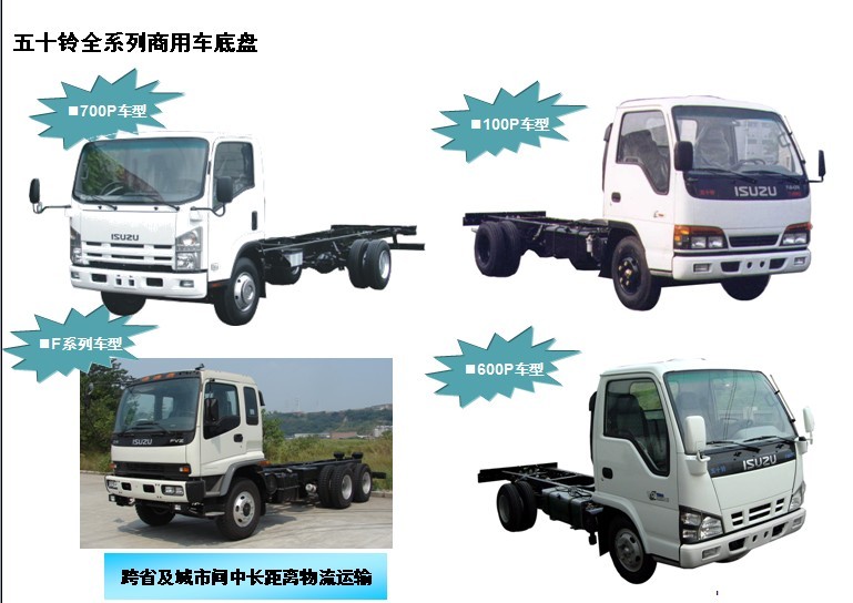 慶鈴汽車全系列產品包括:N(100P,600P)、TF/UC、700P、F系列(FTR,FVR,FVZ,P430)商用車,全面覆蓋重、中、輕全系列商用車型,每系列均有多種軸距、多種噸位、多種貨箱長度的車型全方位應對現代物流的發展需求。