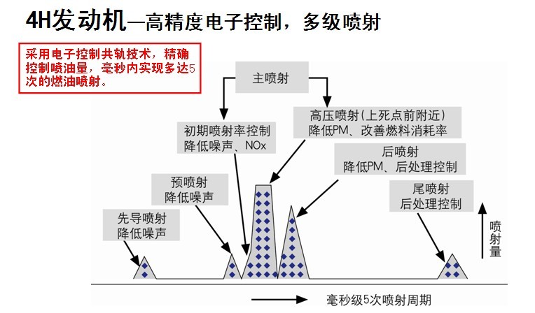■ 先導噴射,降噪聲; ■ 改善燃燒率,降低油耗; ■ 尾噴射,降排放。