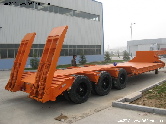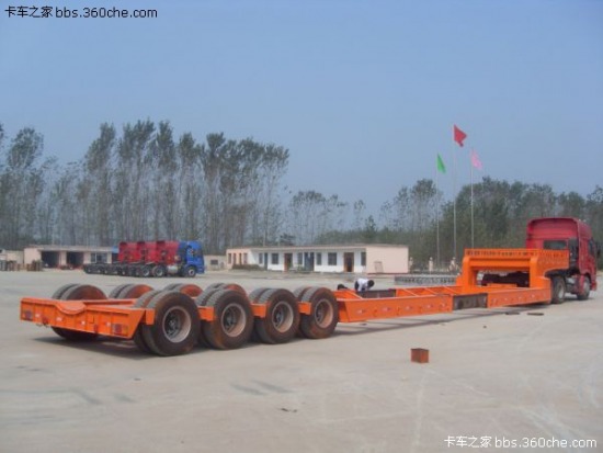 載貨部位的底板為平板結構且無欄板的半掛車,后三橋的凹梁結構也叫高低高,據說下圖中的這臺車重14噸,保拉100噸集中載荷,梁山某大廠出的。