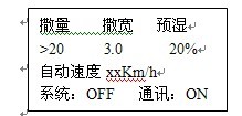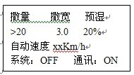 注意:撒布量、撒布寬度、車速三項參數在數據計算中是乘積關聯關系,如果其中一項或幾項過大會導致撒量電機的給料速度超過1600轉/分,在這種情況下,控制儀就會報警,并且撒量電機的給料速度固定為1600轉/分,此時,因將撒量值或撒寬值減小,或者使車速減小,達到撒量電機的轉速小于1600轉/分。