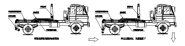 ①將伸縮缸操作手柄推至提點出位置,活動套臂內的油缸推動伸縮拉臂向前平推,從而帶動垃圾箱體向前平移,松開縮油缸操作手柄;