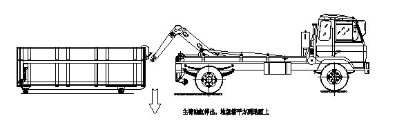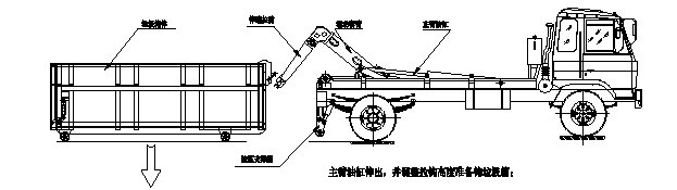 將主臂油缸操作手柄推至伸出位置,主臂油缸伸出,活動拉臂旋轉,帶動垃圾箱體慢慢放下車,直至主臂油缸完全伸出回,垃圾箱平放在地面上,松開主臂油缸操作手 柄使其回到中位;如圖: