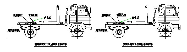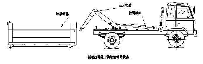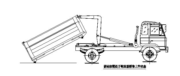 步驟9. 垃圾箱放置好后,調(diào)整活動(dòng)拉臂鉤與箱體彎鉤位置,使其脫鉤,將拉臂操作手柄推 下到落下位置,拉臂油缸收回,活動(dòng)拉臂繞翻轉(zhuǎn)翻轉(zhuǎn)架前鉸鏈軸旋轉(zhuǎn),活動(dòng)拉臂放回到附 車架上,松開取力器垃圾箱放置完成,整車可以運(yùn)輸行駛。
