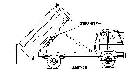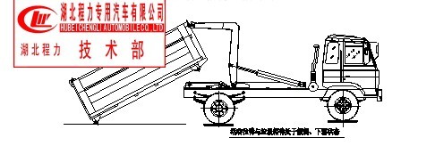 步驟6.垃圾卸完后,推下拉臂操作手柄至落下位置,垃圾箱體下落到附車架上,松開取力 器并鎖緊箱體后門,卸垃圾工作完成,整車可以運(yùn)輸行駛。