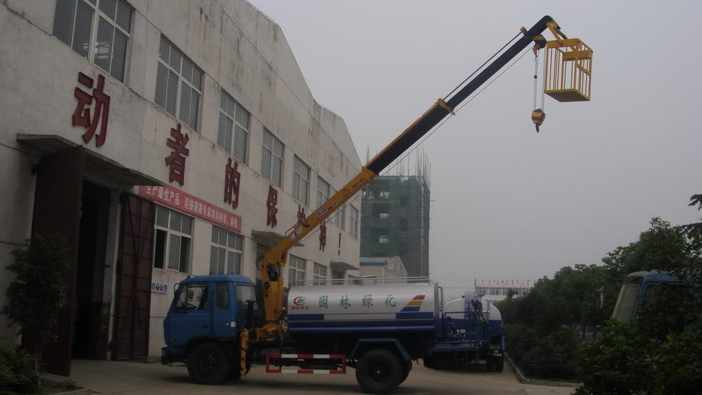 高空灑水隨車吊 隨車吊帶高空作業和灑水車一起,適用于園林綠化和市政環衛,是一種多功能的實用的交通工具,吊籃可以裝路燈和剪樹枝,吊籃不用時可以卸下來。這種結構的車在上牌的時候是參照隨車吊的公告。