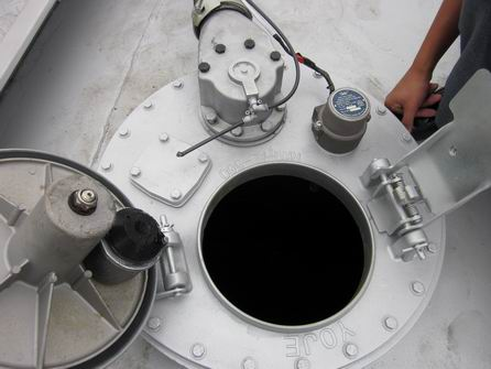 上圖是鋁合金歐標(biāo)罐口,又稱人孔蓋,安裝于油罐頂部,具有內(nèi)置呼吸閥和緊急排氣功能,并可在人孔蓋上安裝油氣回收閥、量油孔、防溢流探桿等,防溢流傳感系統(tǒng)在裝油的過程中,當(dāng)液面到達(dá)探測位置時(shí),傳感系統(tǒng)將自動(dòng)報(bào)警,從而停止裝油。內(nèi)置呼吸閥使油罐在運(yùn)油過程中內(nèi)部壓力保持穩(wěn)定,與外部壓力達(dá)到平衡,其傾倒防止溢流的設(shè)計(jì)使油罐車在發(fā)生意外的情況下保持密封,緊急排氣裝置在罐內(nèi)壓力急劇升高的情況下,將自動(dòng)打開,釋放罐內(nèi)壓力,從而防止事故的發(fā)生,大大提高運(yùn)油的安全性。