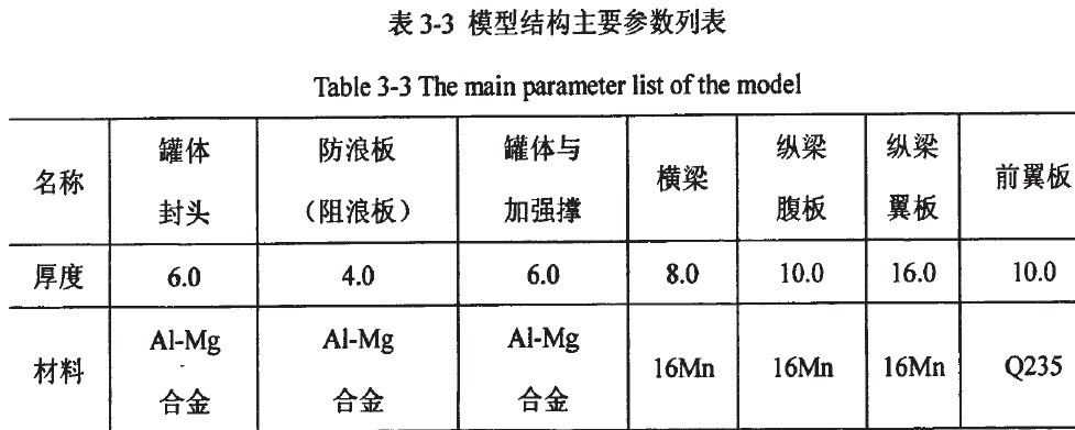 油罐車罐體與車架進(jìn)行有限 元建模,其主體結(jié)構(gòu)由幾節(jié)罐體依次焊接而成,端部焊接兩扁平封頭封閉罐體。罐體 總成基本參數(shù)如表3-3所示。