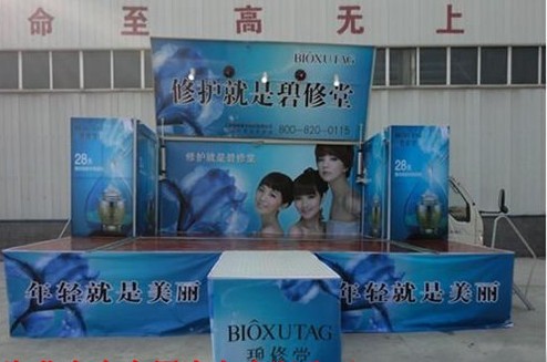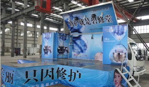 東風福瑞卡底盤,朝些發動機,舞臺兩面展開,全自動全液壓,頂部可以升降,內藏式舞臺板,后門可展開形成音響平臺,主舞臺面積約28平方米。