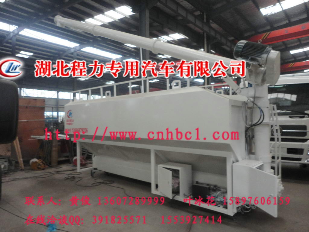 湖北程力專用汽車有限公司生產銷售的散裝飼料車的飼料罐架設在卡車的底盤上,專用設施由罐體總成、輸送系統(水平卸料系統、垂直卸料系統以及活動卸料系統組成)、散裝飼料車罐,液壓系統(高壓油泵經管路與分配閥連接該閥的三個輸出端分別是轉角液壓馬達、升降油缸以及串聯在一起的水平卸料、垂直卸料、活動卸料液壓馬達)、散裝飼料車罐電動系統、氣動分倉機構等組成。在罐體底部設有閘門,在閘門下面裝有水平螺旋輸送器(俗稱水平攪籠),由取力器由汽車變速箱輸出動力驅動,再傳動高壓油泵以驅動液壓系統,散裝飼料車罐,液壓馬達通過傳動裝置帶動水平螺旋輸送器的葉片軸及葉片旋轉,經活動輸送系統(俗稱活動攪籠)以將飼料輸出。車頂平置的一根活動卸料絞龍可自由回轉和抬升,運輸時頂部的螺旋管平臥在罐頂;卸料時則抬起,散裝飼料車罐使管端的出料口與畜禽飼養場貯料罐頂部的進料門相接、對準,完成卸料。湖北程力專用汽車有限公司新研發、生產的散裝飼料車,又名散裝飼料運輸車。結構簡單、性能可靠、輸送量大、操控方便、機動性強、對物料無污染等特點,廣泛應用于各大中小型養殖企業的飼料的運輸。公司從開發設計、生產加工、出廠檢驗、安裝調試、售后服務都有一套科學嚴密的管理程序。