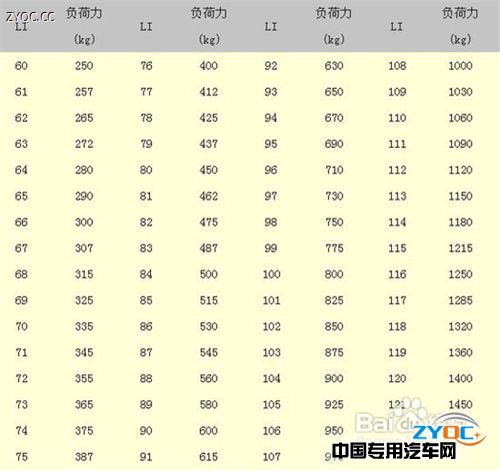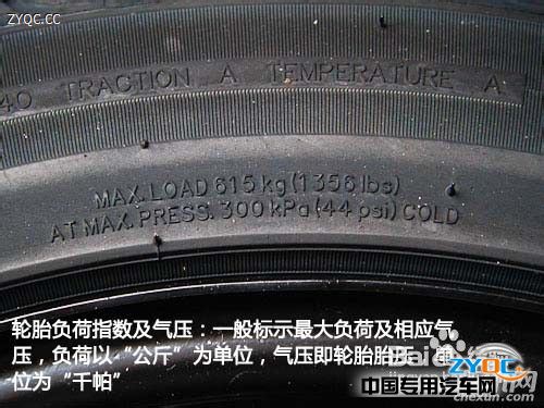 一般標示最大負荷及相應氣壓,負荷以“公斤”為單位,氣壓即輪胎胎壓,單位為“千帕”。