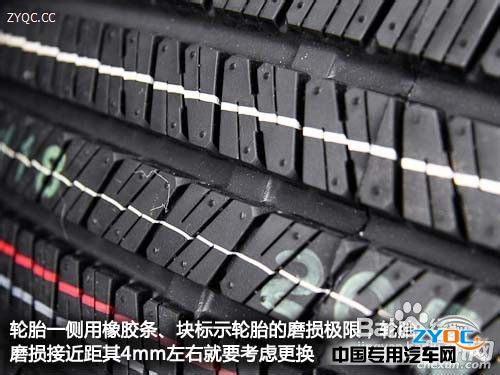 輪胎一側用橡膠條、塊標示輪胎的磨損極限,輪胎磨損接近距其4mm左右就要考慮更換。
