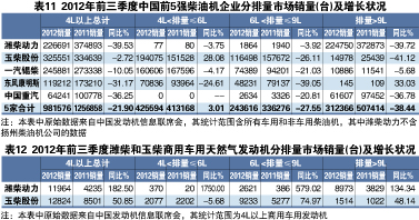 由表12顯見,在中重型商用車柴油機市場極度低迷的狀況下,2012年中國商用車用天然氣發動機市場卻異常火熱,特別是6L以上的大中排量機型尤甚,說明近兩年中國天然氣卡車和客車發展步伐加快。