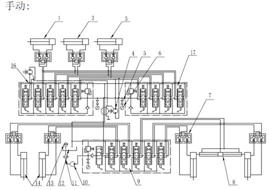 當下部工作時,扳動支腿操縱閥中相應操作桿,壓力油經各管道和雙向液壓鎖使相應的支腿動作。