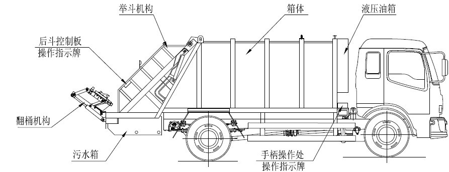 步驟10.旋轉推板操作旋鈕至左收回位置,推板被收回,松開旋鈕;再旋轉舉斗操作旋鈕至左下落位置,斗體放下并與車箱鎖緊,松開旋鈕,同時松開取力器(若翻桶機構為放下位置,請將其翻上),此時整車可移動。整車移動時各機構位置如圖所示: