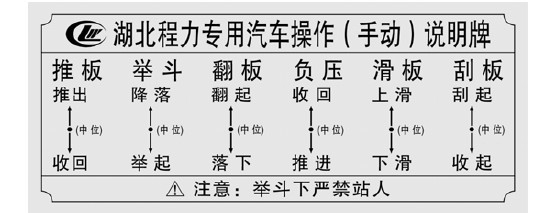 在裝載垃圾前,空載運轉達到6個標準時,掛上取力器(駕駛室內方向盤左下方),檢查各部件有無泄漏或異常后,再按照操作旋鈕牌指示位置進行操作;