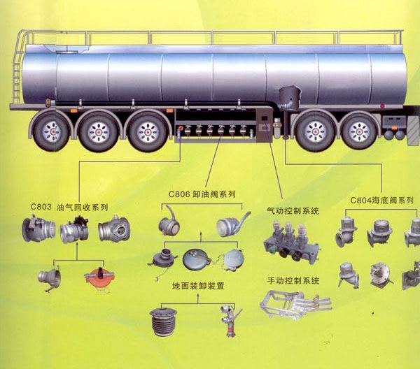 下裝油油罐車主要產品配件有:人孔蓋、油氣回收閥、油氣回收接頭、海底閥(緊急切斷閥)、卸油閥、防溢流傳感器等。產品具有設計合理,工藝先進,安全可靠,節能環保等優點。