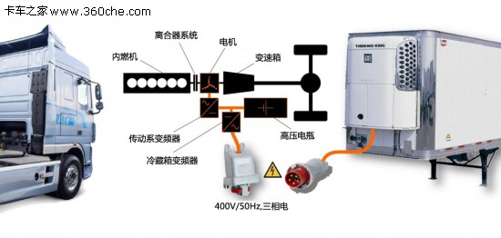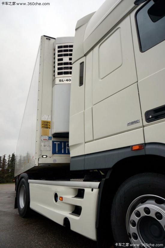 車上可以看到,電機位于離合器系統和變速器之間。掛車上連接著冷藏車的冷凍裝置。高壓電池組供電分為兩部分,一部分供電給掛車上的冷藏箱,一部分通過電機供電給動力系統。達夫希望在其它應用方面上的混合動力可以提供經濟效益。目前達夫已經與眾多廠商咨詢,以確保未來的系統兼容性。此外,該系統盡可能地使用通用配件,讓客戶自由選擇其配置和構造。