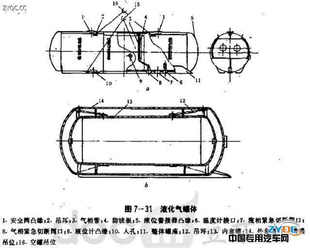液化氣罐車的罐體為承壓容器,如圖7-31所示。它是液化氣罐車的重要組成部分。為了降低材料消耗,保證罐體具有足夠的強度和剛度,必須采用各個方面受力均勻的圓形截面或球形罐體。