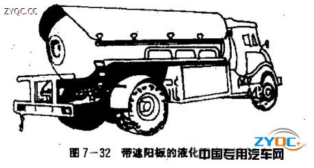 對于裝運低溫物質(zhì)或有特殊要求的液化氣罐,還必須采取隔熱保溫措施,防止因超溫、超壓而發(fā)生事故。常采用以下三種措施:一是隔熱層,在罐體表層敷設(shè)隔熱保溫材料(如泡沫塑料、玻璃棉、巖棉、聚氨酯等),在其外殼上又包有蒙皮。這種隔熱保溫方式用途廣泛,價格較低,質(zhì)量也較輕,常用于裝運液化乙烯、液化二氧化碳罐車等;二是真空夾套,如圖7-31b所示,在液化氣罐的外面再加一層罐體,兩層罐體之間填充干燥劑和保溫材料,并抽成真空。它具有良好的隔熱效果,是裝運液氧、液氬等低溫介質(zhì)的理想罐體;三是遮陽板,如圖7-32所示。它是在罐體的頂部裝設(shè)防止陽光暴曬的遮陽板,遮陽板與罐體相隔一定距離,形成前后相同的夾層。罐車行駛時,利用流動氣流散熱。遮陽板采用反光較強的白色,以降低吸熱量。這種結(jié)構(gòu)多用于液化石油氣罐車。