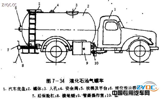 液化石油氣罐車也有單車、半掛車和全掛車之分。液化氣罐體有承載式和半承載式,普通液化石油氣罐車一般都是在其基本車型的基礎(chǔ)上改裝而成,如圖7-34所示。罐體用螺栓固定在汽車車架上。