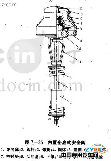 液化石油氣罐車采用內(nèi)置全啟式安全閥,如圖7-35所示。該閥屬于單反沖盤結(jié)構(gòu),彈簧3部分裝在罐體內(nèi),降低了安全閥外漏部分的高度,對降低車輛高度和安全閥自身安全是有利的。反沖盤8裝在閥桿2的頂端,彈簧3裝在閥體4的下方,閥桿下端與彈簧之間裝有導(dǎo)向套1.它對彈簧起導(dǎo)向定位作用,彈簧下端通過彈簧座由螺母鎖緊在閥桿2上,通過調(diào)整該螺母來調(diào)整彈簧3的預(yù)緊力,以調(diào)整安全閥的開啟壓力。彈簧3表面進行鍍鉻防腐處理,以延長其使用壽命。