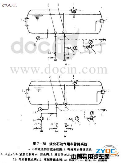 圖7-38為常用的液化石油氣罐車的管路系統(tǒng),有的還設(shè)有液化石油氣計量系統(tǒng),以達到準(zhǔn)確裝卸的目的。