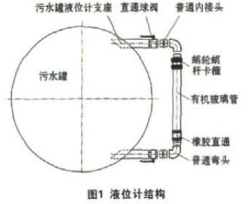 吸污車常用的液位計結構如圖1所示,其結構由污水罐液位計支座,直通球閥,內接頭,有機玻璃管,橡膠直通,彎頭,蝸輪蝸桿卡箍組成,吸污車在作業過程中,由于真空泵的連續工作,在污水罐罐體內形成真空,與外氣壓形成壓差,污水 ,污泥則通過吸污管不斷地吸入到污水罐內,根據連通器原理,污水罐內液位的高低會通過透明的有機玻璃管液位計顯示出來,由于污水污泥中不可避免地混入較大形狀的污物,如石塊,泥塊,瓦塊等硬物,有可能會堵塞污水罐液位計管道,造成液位計顯示朱真,當污水罐內的液位高于設計高度時,部分污水很容易通過抽真空管路被吸到真空泵內,污水中的微小顆粒會造成泵內零件磨損或將葉輪卡死,故此,必須硫通液位計管路,疏通時需要使用專用工具拆開橡膠直通,彎頭,蝸輪蝸桿卡箍等連接等,給維修帶來了不便,也影響了使用壽命,針對這個問題,對該液位計安裝結構進行了改進。