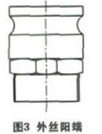 外絲陽端一端為管螺紋結構,另一端為環形槽結構,其結構如圖3所示,其中管螺編班端與四通密封連接,環形槽端與堵蓋密封連接。