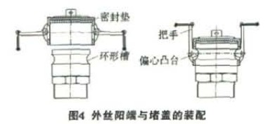 外絲陽端與堵蓋的裝配如圖4所示,國4(a)為外絲陽端與堵蓋的分離狀態,此時堵蓋的把手為水平狀態,偏心凸臺偏出堵蓋內壁,陽端可自由出入;國4b)為外絲陽端與堵蓋的密封狀態,此時堵蓋的把手為豎直狀態,偏心凸臺偏進堵蓋內壁,卡住外絲接頭的環形槽,外絲接頭端部在凸臺偏心力的作用下,壓緊堵蓋內的橡膠密封墊,從而實現密封,同圖4可以看出,直接用手操作堵蓋把手便可快速完成堵蓋的開啟,密封也不需要專用工具。國此,當污水罐液位計管路堵塞時,可打開側面的堵蓋,通過四通連接水平方向的污水罐液位計支座,外絲陽端,可實現污水罐液位計支座的疏通,打開上下兩端的堵蓋,通過四通連接豎直方向的有機玻離管,外絲接頭,可實現有機玻離管的疏通。