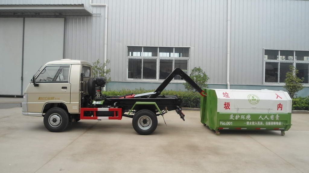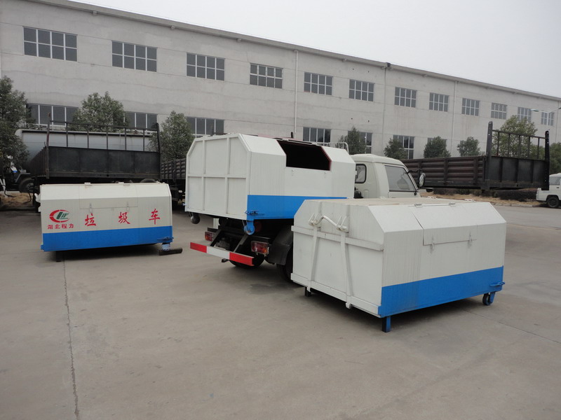 箱體可卸式垃圾車附車架采用16號低合金槽鋼、20號方管與8mm、5mm、4mm、16Mn鋼板焊接而成,翻轉架與活動拉臂動作設計合理可靠,實現拉箱、鎖緊、放箱和自卸操作簡單方便。 垃圾箱拉到附車架上時,有側向導向塊定位及鎖緊鉤鎖緊定位,整車行駛中箱體無歪斜現象,安全可靠。 附車架前端設有水箱,便于操作人員及時清理污物,保持干凈整潔。