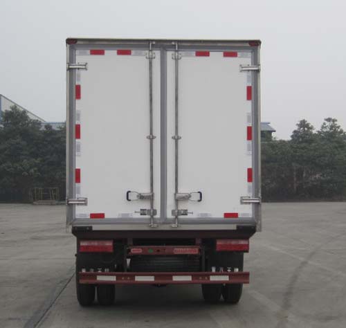 選裝前臉和保險杠 ,僅選用底盤的3360軸距;選裝單排駕駛室及前面罩;裝排半駕駛室,貨箱長3700mm,裝單排駕駛室,貨箱長4000mm;該車型的用途是貨品的冷藏運輸, 裝 BGY-160 車用制冷機組;防護欄均采用Q235鋼板壓制成型,均采用螺栓連接方式;后防裝置下邊緣的最大離地高度為400mm,斷面尺寸為120mm×50mm。